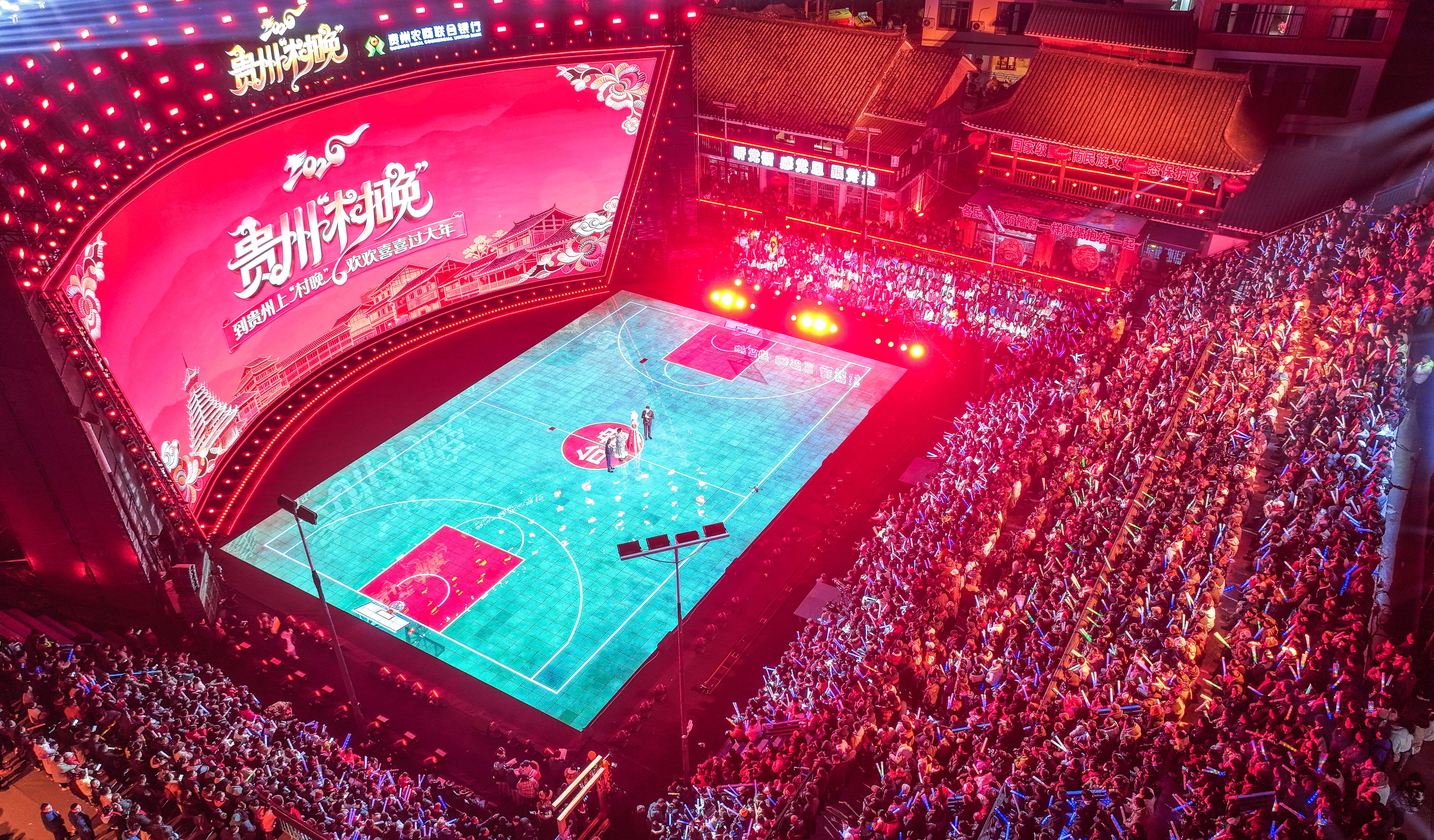 2月3日,观众在台江县台盘乡“村BA”球场观看贵州“村晚”(无人机照片)。新华社记者 杨文斌 摄各地兴起的“村晚”,不仅是一场文化盛宴,更是展现乡村经济蓬勃发展的大舞台。